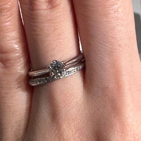 私がいくつもの指輪からこちらともう一つまで絞り、スタッフさんにで指診断をしてもらい、手が長くて細く、指の形からこちらをオススメして頂きました。 婚約指輪と結婚指輪でセットになっており2つ一緒に付けてもしっくりくる所がお気に入りです。