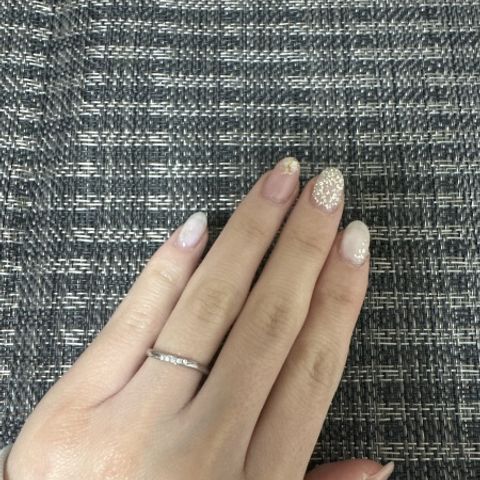 写真で見ていたときはストレートの指輪がいいな。と思っていたのですが、骨格診断をしていただいて2人ともウェーブタイプの方が指が長く見える、フィットする。ということを教えて頂き、実際に2タイプとも試着したところ、スタッフさんの教えてくださったようにウェーブがしっくり来たので、ウェーブのリングにしました。 ダイヤが5つあってシンプルながらもキラキラ感があって、とても気に入っています。