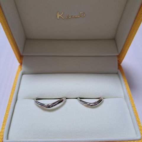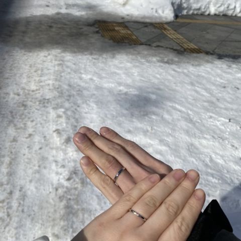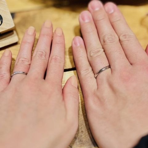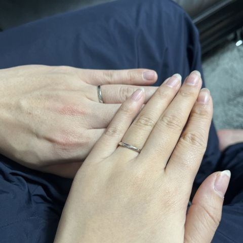 一部分が細くなっており、指が細く綺麗に見えるデザインでした。また、女性の方にはダイヤがついていましたが、ペア感が感じられ、すごくよかったです。 最後に内側の部分が丸くすごく滑らかで着け心地が最高でした。