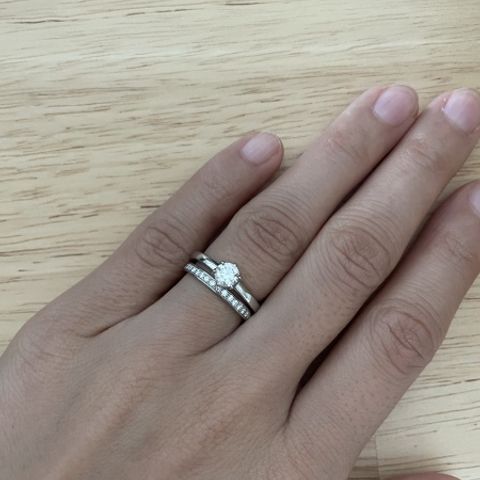 結婚指輪と重ね付けした時に馴染み、かつ婚約指輪単体でつけた時にも手元が寂しくならないデザインで探しました。両脇にメレダイヤがあることで華やかに見えますが、可愛らしすぎることもなく、とても好きなバランスでした。また、爪が低めなので普段使いしやすいところも決定のポイントです。