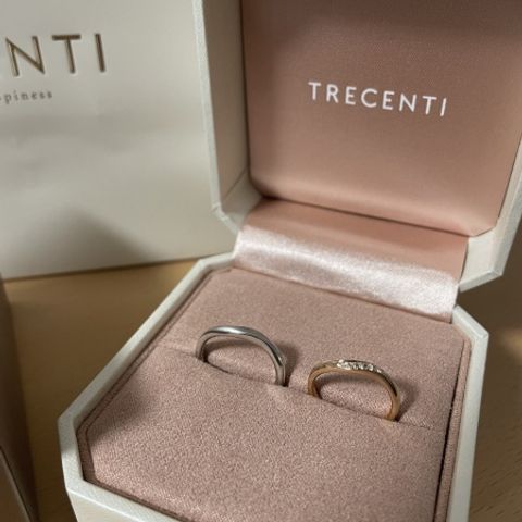 内側のピンクゴールドが美しいです。指に付けた時に、隙間から見えるピンクゴールドがアクセントになっていて良いです。奥さんの方はダイヤをつけていますが、これも美しいです。シンプルめなデザインなので普段から自然に着けていられます。