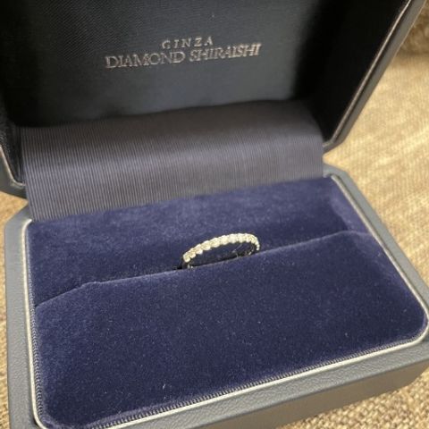 結婚指輪も年齢重ねていってもずっと手元が映える様に、エタニティタイプを探してました。 最初は細身でエタニティなのに真ん中にプラチナの線が入ってるJUNOを選んでましたが、シンプルなエタニティリングをシライシさんで見せてもらってなかったなぁと2度目に見に行かせてもらった時に再度候補として見せてもらいました。 細めのハーフエタニティリングだとJUNOとあまり変化なかったのですが、少し太めの物になりますと見せていただいたこちらに目を惹かれました。 婚約指輪を細身で選んでいたので、結婚指輪を少し太めにしても重ね付けしてもバランス良かったです。 最後までこちらと最初ので迷っていましたが、彼が結婚指輪単体で付けた時にどちらに惹かれるかで決めたら? と言ってくれた事、年齢をさらに重ねた時にどちらの指輪が映えそうかを考えて、このハーフエタニティで決定しました。 華やかであって上品さもある。 年齢重ねても大丈夫なデザインをと考える方には特にオススメです!!