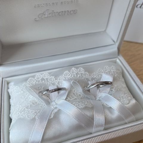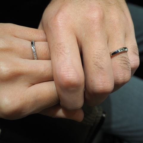 リングの幅から、削り方、素材すべて職人さんと相談して決めました。1から2人でつくりあげる過程も含めて素敵な思い出になりました。ぱっと見似たようなデザインですが、1つはベースがホワイトゴールド、もう1つはプラチナになっていて輝き方がそれぞれ異なるところが気に入っています。
