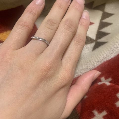柔らかなウェーブのデザインでどんな場面にもあわせやすい素敵なデザイン。 なめらかで指につけた付け心地もよかった。かすかに見えるダイアは主張すぎず婚約指輪との重ね付けも可愛くまとめられそうです!細いデザインですと価格は抑えられますがせっかく長くつけるものなので選んだ太めのデザインにして大正解でした。