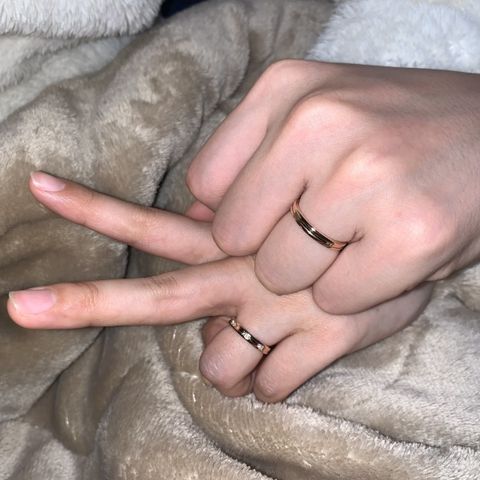 【指輪のデザイン】 V字になっていて着用時の指の形が綺麗に長く見えるのがとても良かった。 色はピンクゴールドを選んだがピンク味があんまり強くなく自分達の場合ゴールドだと指輪が浮くような印象だった為その点を踏まえるととても良かった。