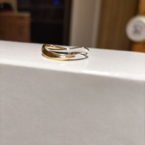 私の指輪はキラキラとダイヤモンドが光ってとても素敵です。指輪にはめる向きによって光り方が変わるのも大好きなポイントです。ストレートだけど動きのあるデザインが可愛いです。 旦那の指輪はゴールドも入っていてオシャレに作ってもらいました。