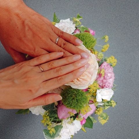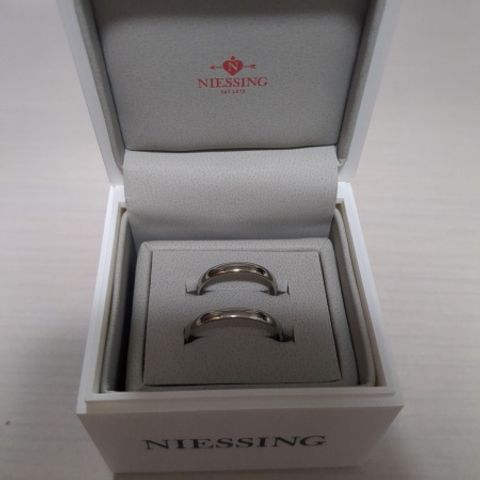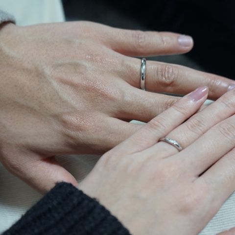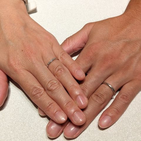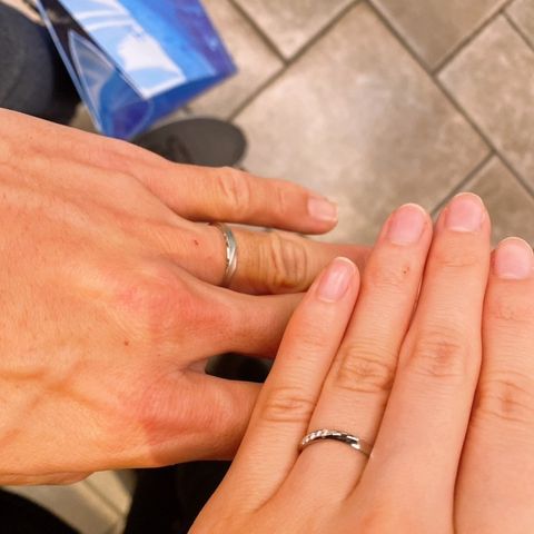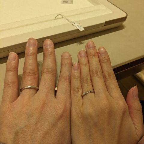 お互い仕事の時にも着けることができる、かつ、何歳になっても着けることができることをメインに選びました。つけた瞬間にカーブの感じや光具合などが気に入ってこれに決めました。男性のものと女性のものでペアになっていてとても素敵です。