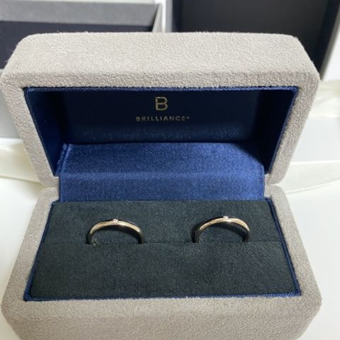 シンプルながら、女性用の方にはダイヤが入っていてキラキラしており、華美過ぎない上品なキラキラさに惹かれました。リングには女性用にも男性用にも斜めのラインが入っていて、指輪を合わせると両方のラインが繋がる二人だけにわかるデザインという点も良かったです。