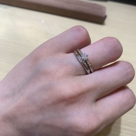 結婚指輪と婚約指輪を重ね付けときにボリューム感がなく、2本がピッタリ合っていて、セットで買う決め手になった。またピンクゴールドも使われており、かわいいしボリューム感が抑えられてよかった。ウェーブ型なので、指の間から間を違和感なく繋いでくれる点もよかった。