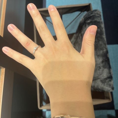デザインがシンプルでありながら、王道ってよりは少し変わったデザインであまり被らない感じが良い。デザインに動きがあるため、中指と薬指の段差にうまくフィットして自然に見える。手元を見るとキラキラと光るダイヤが綺麗でした。