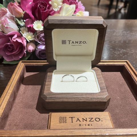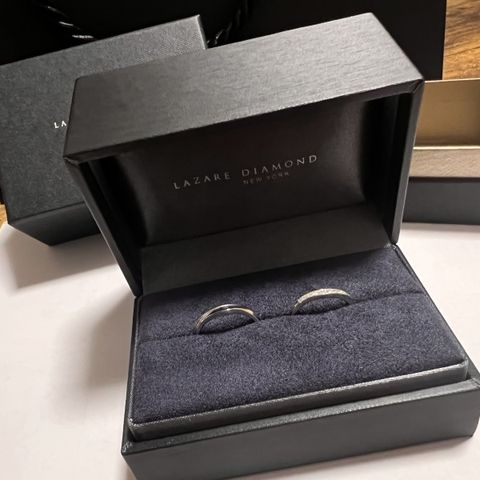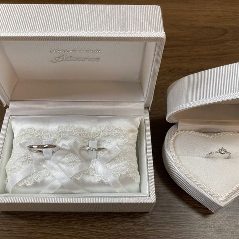 結婚指輪は新郎新婦ともにお揃いデザインで、華奢なデザインとひねりのような形が素敵で、ダイヤも華奢ながら煌めきがとても綺麗でした。 婚約指輪はオーセンティックなデザインでダイヤの輝きがとても綺麗で素敵です。