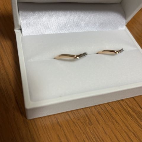 2色使いでデザインがかわいくて気に入りました。 プロポーズでもらったリングもケイウノのものだったので、重ね付けができるようなデザインを探していました。 V字のようになっていたので、婚約指輪との相性も良くとてもよかったです。