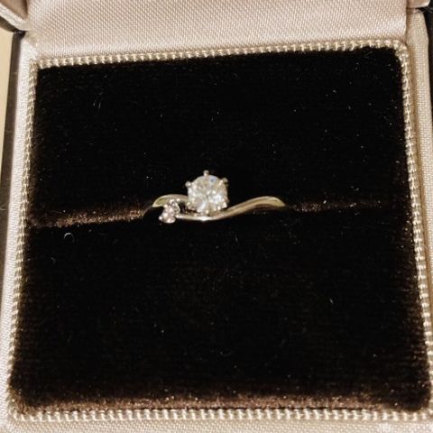 とてもキラキラしていて可愛い、上品かつ輝きがあって目立つ。一つだけでなくサイドにもダイヤモンドがついていてデザインとしてもとても華やかに見え、遠くからでも輝きが綺麗に見える。ダイヤモンドのところに爪ががないタイプのデザインで仕事中にも着けやすいのがこの指輪を選んでくれた理由。