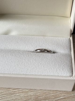 指輪はシンプルなものを探していましたがスタッフにダイヤモンドがある方が良いと言われ付けてみるとやっぱりダイヤモンドが輝いて素敵でした。指にはめていても違和感がなくアレルギー体質でもあるのですが皮膚トラブルも出ていません。