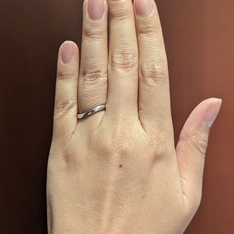 指を綺麗に見せてくれる指輪だったのでこちらに決めさせて頂きました。着け心地もとてもいいです。彼とは曲線は一緒にしたのですが素材は少し違うものにしました。どちらもとても気に入ってこれからずっと着用させて頂きます。