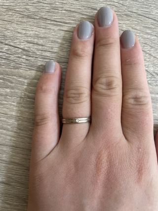 シンプルだけどラインが入ることでちょっとデザインの主張もできるデザインです。 角ばっていなくて指にはめたときフチの丸みがいい手触りです。 どんな場所でも邪魔にならないデザインが好みなので、ぎらぎらしすぎない艶消し加工もお気に入りです。