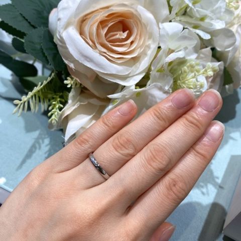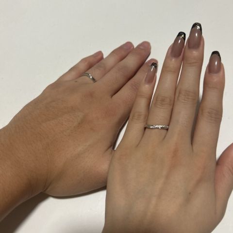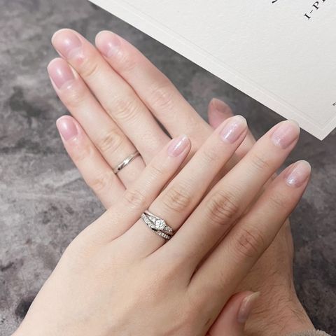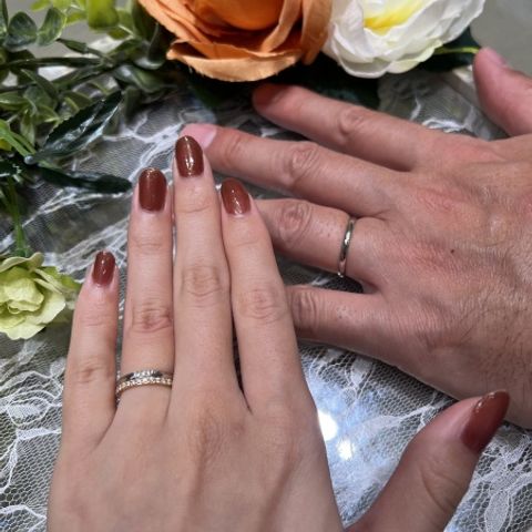 試着した時に付け心地が良く、すぐにこれだと思いました!ダイヤが11個付いているのでライトに当たるとキラキラ光ってとても気分が上がります。旦那さんの方も飽きないようなデザインになっているので2人ともお気に入りです。
