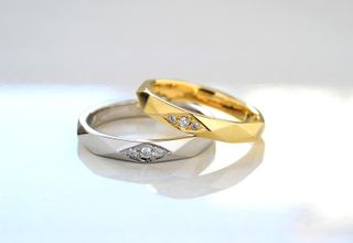シンプルなデザインだが、緩やかなカーブが特徴的で着け心地が良い。女性側の指輪にはダイヤが埋め込まれていて、さりげなくもキラッと光るデザインが良い。内側には夫婦のイニシャルや、日付け等を刻むことが出来る。