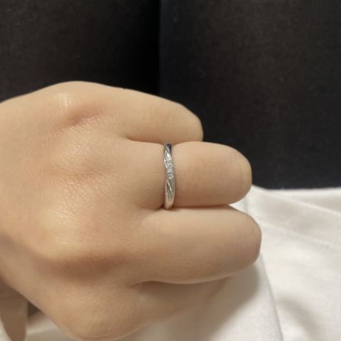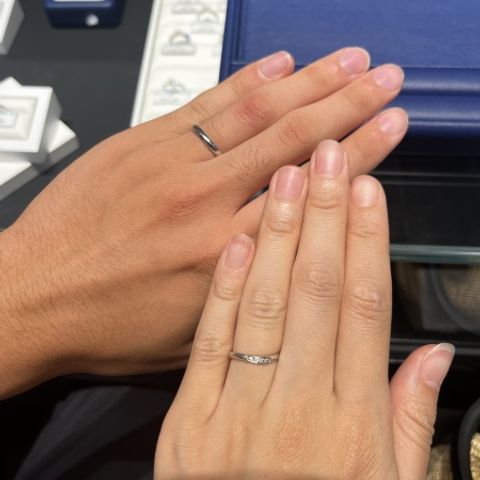 彼はシンプルなもので、異なる太さを着け比べてみました。私はあまりキラキラしすぎず、でもダイヤはつけたかったので選びました。この商品は、外側から見るとあまりキラキラが目立たないですが、自分側からみるとはっきりとダイヤが見えてキラキラするのがポイントです。