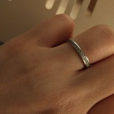 素材はpt950です。シンプルなデザインですが、カットが入っている事でキリッとした印象になります。付け心地も良く、普段からつける事ができます。指輪の高さが少しあるのかな?と思っていましたが、付けてみると気になりませんでした。