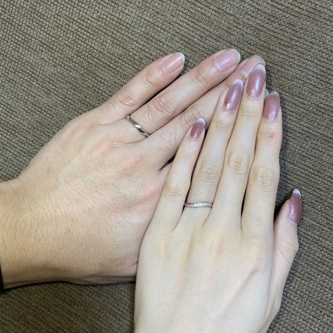 彼と一緒に結婚指輪を探しにいろんなお店を回りましたが、最終的に着け心地の良いものにしました。 偶然、婚約指輪との重ね付けもバッチリハマって、これしかない!と2人でびっくりしました。デザインもシンプルでずっとつけていられます。