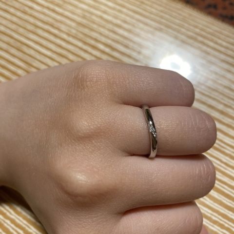 程よいボリュームで指が華奢で綺麗に見え、とても気に入っています。またダイヤモンドの主張も激しすぎず、婚約指輪との相性も抜群で大変満足しています。これから末永く身につけたいと思える指輪を見つけられました。