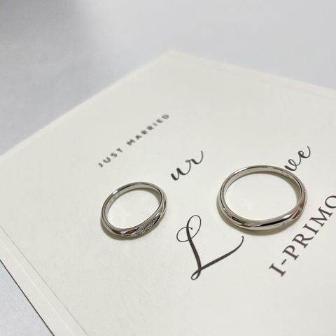 レディースリングは右サイドにダイヤモンドが多くついており自分からは華美に見えますが、他人から見た際には左手サイドにはダイヤモンドがついていないため、華美に見えすぎないデザインが気に入りました。 メンズリングには、レディースリングのダイヤ部分と同じ所にオプションでマット加工を付けていただき、オシャレになり、ペアリング感がより増しました!