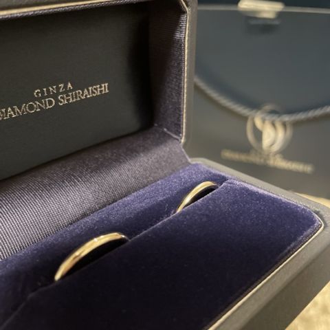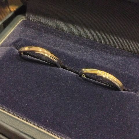 シンプルながら、金糸が一筋入るデザインと、製作過程で自分達も手を加えられる純糸結びを選びました。純糸結びは思いのほか難しかったですが、楽しく良い思い出になりました。 スタッフさんやデザイナーさんが丁寧に相談に乗ってくださり、両指輪とも、外側には妻の誕生石、内側は夫の誕生石を入れていただきました。外側の双子のダイヤモンドはさりげなくキラっと輝きます。内側は金糸の結び目とガーネットが入り、2人だけこっそり楽しめる、素敵な指輪を作って頂きました。