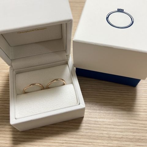 イエローゴールドで、キラキラしすぎないようブラシマットにし、丸みを持たせた指に馴染むデザインで、とても気に入っています。夫の方はグレイッシュゴールドで鏡面にしましたが、こちらもキラキラしすぎず落ち着いた輝きがあります。