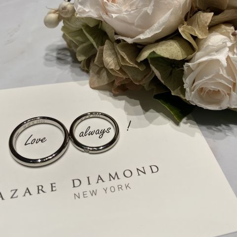 小さなダイヤモンドがいくつもついてる王道の結婚指輪が絶対欲しくて、その中でもとにかく惹かれるデザインにしました。ブライダルキャンペーン中でダイヤモンドの輝きが増す「ハート&キューピッドダイヤモンド」に無料でグレードアップできる期間だったのでお得でした! 内側には入籍日、お互いのイニシャル、相手の誕生石を入れました。