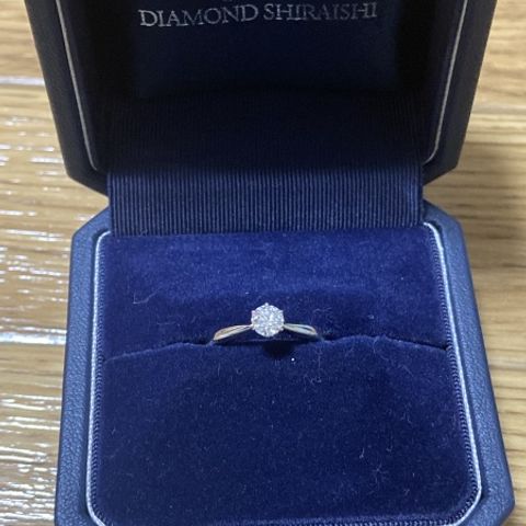 カットとカラーが素晴らしく、大きさも希望通りのダイヤモンドに出会えたため、こちらでオーダーすることに決めました。 枠は、センターダイヤの両脇にメレダイヤの付いたかわいらしいものです。 脇石があるため、高さや引っ掛かりもあまりなく日常使いしやすいところも理想的でした。