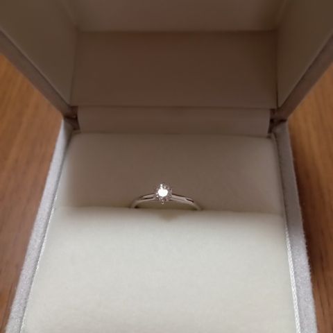 ソリティアとメレで悩んでいて、その両方の良いとこどりのデザインだったため決めました。つけ心地が良く、立て爪タイプでも高さが低めで引っかかりにくい点も魅力的でした。上品ですが可愛らしさもあり、とても気に入っています。