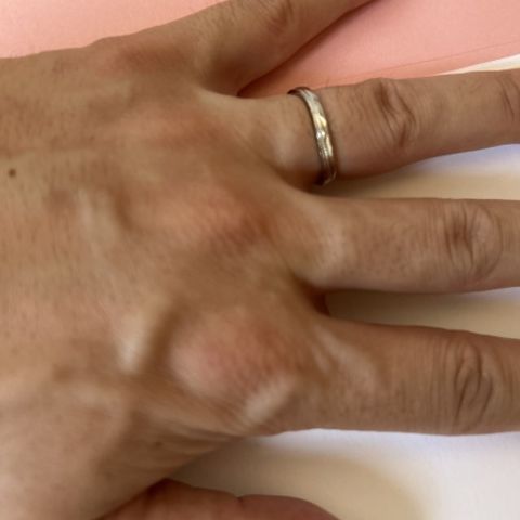 S字(うねり)のデザインは太めになりがちの中、こちらは細身で着心地もよかったです。角度によって見えた方が変わるので、二人とも石なしでオーダーしました。仕事で力仕事や薬品を扱う業務もあるためプラチナという素材も安心感があります。価格にも納得して決断できました。
