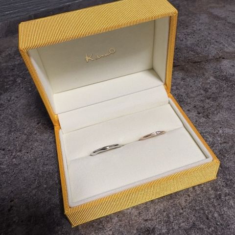 ケイローンは2つのリングを並べると、それぞれの道がつながって1本の道になるデザインになっているそうでペアの指輪がより一層特別に感じられます。斜めに入ったダイアも可愛くて指を綺麗に見せてくれます。指輪が薄いため違和感なく着け心地も良いです。