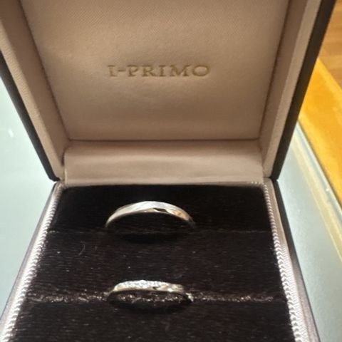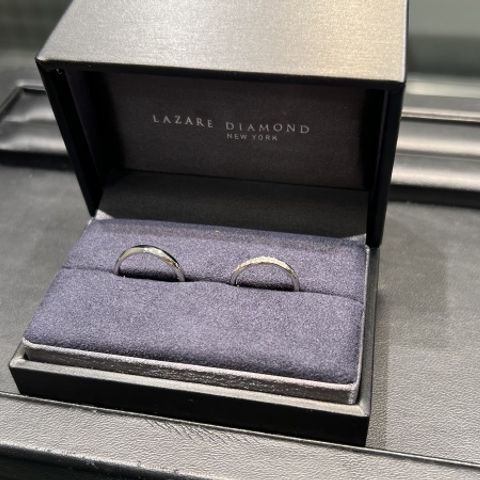男性用はマット加工、女性用はウェーブのデザインで、左右どちらから見てもキラキラと見えて他の人から見えた時にも指が綺麗に見えるデザイン。また、指に馴染む形で、シンプル過ぎずゴージャス過ぎず、とてもいい指輪を選ぶことができました。