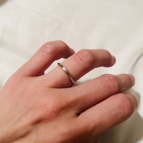 着け心地がよく、肌によく馴染むデザインでした。さり気ない光り方と他には無いデザインも気に入ったポイントです。 他にも色々と試着しましたが、1番着け心地が良い指輪でした。毎日身につける事を考えると、着け心地の良さに重きを置いた方が良いかと思い、こちらを選びました。