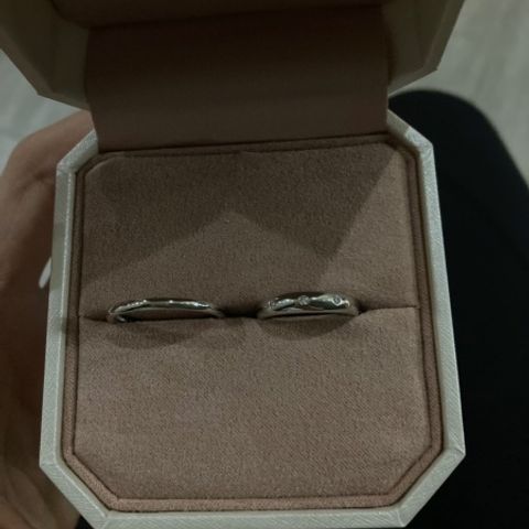 女性用リングは斜めにダイヤが入ってるので指が細く見える。且つさりげなくダイヤが輝くのでふとした時にワクワクする! 男性用はマット加工がとても素敵で他には無いデザインだと思う。裏にも刻印やストーンが入れられて、それも自由に考えられるのが楽しい!