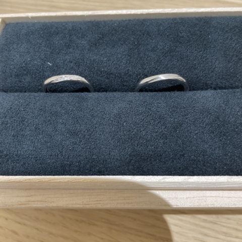 指輪のデザインは、同じ幅のラインで、それぞれ違う加工をいれてもらいました。鎚目加工はキラキラして可愛く、つや消し加工はかっこよく大満足です。お揃い感のあるデザインにできて、一緒に着けてたくさん出掛けたくなりました。