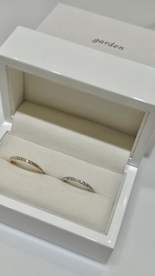 歴史あるミル打ちゴールドにプラチナのコンビネーションは、ずっと憧れていたもの。そこにハーフエタニティのデザインは付けている手を見るだけで気持ちが上る、お気に入りのデザインです。主人はダイヤ無しのシンプルなミル打ちゴールドにかまぼこプラチナのコンビネーション。 2人とも気に入りました。