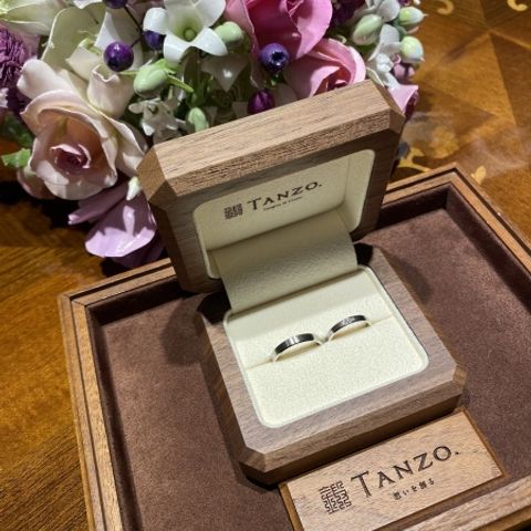 指が短く丸みを帯びていたため、v字デザインのものを検討していましたが、他社ではv字がキツく好みのものが見つかりませんでした。 しかしTANZOさんで指輪を拝見させていただいた際ゆるいv字があり、指にぴたりとはまるものがみつかりました。 また、エッジをいれることで二人の指輪の形が違っていてもおそろい感を出すことができたことが決め手となり、TANZOさんにお願いしました。 たくさんの組み合わせの中から好みのものを選ぶことができるため、自分の好みのものを選びたい方におすすめのお店です。