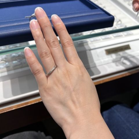 デザインがシンプルかつ綺麗で、日常生活で浮かない指輪を探していた私にぴったりの指輪でした。 指を細く長く綺麗に見せてくれる素敵なデザインで、最初の試着からずっとお気に入りのひとつでした。 婚約指輪との相性もよかったです。