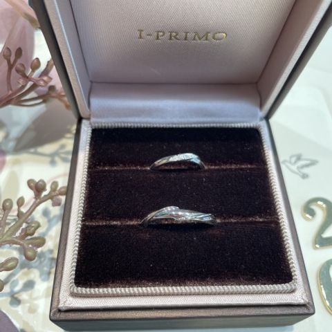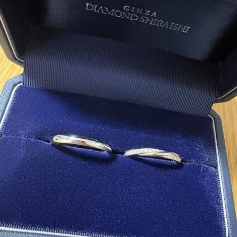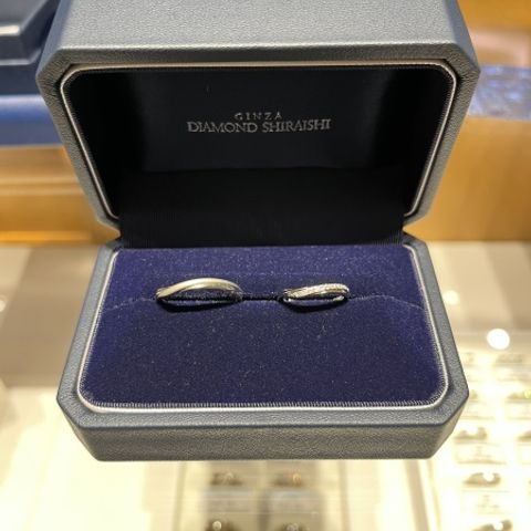 シンプルで日常遣いしやすく手に馴染みやすいです。ウェーブのデザインにダイヤが埋め込まれたデザインで自分の希望するものが全て詰め込まれていてお勧めされてとても気に入りました。また夫の方はデザインや太さなどを細かく相談に乗っていただけました。