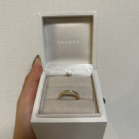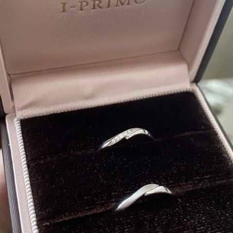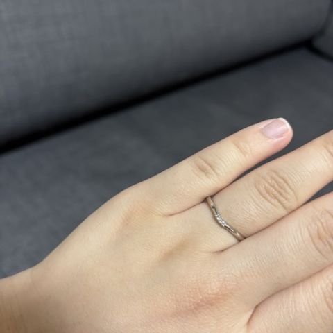 ウェーブで着け心地がよかった。 ウェーブの結婚指輪とカチッと密着してしまうのではなくて、ダイヤの周りがぎゅっと絞られていて、結婚指輪とも隙間ができてシースルーみたいな抜け感がある感じがかわいかった。 繊細な細工で外の光を取り込みダイヤの輝きをより強調させてくれる感じがあって良かった。