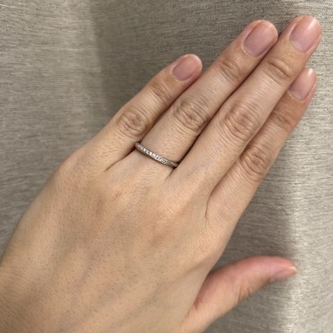 デザインはシンプルだけど指輪の滑らかなカーブに合わせてダイヤモンドが配置されており、指が綺麗にみえます。 年齢を重ねた時に、ダイヤモンドの輝きがあることは女性の美しさを引き立ててくれるというお話をきき、日常遣いにしても派手すぎず、でも結婚指輪の特別感を味わえる指輪です。