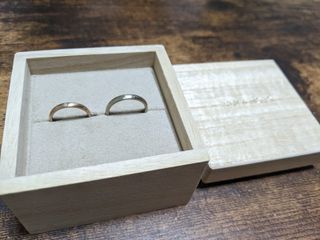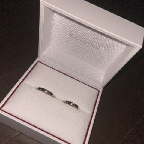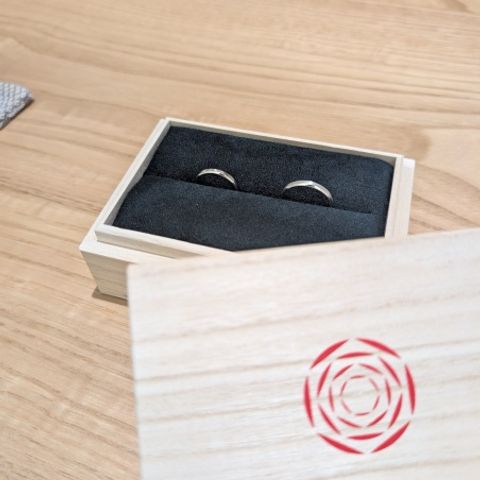 ペア感を出したくてフルオーダーのオリジナルデザインにしました。 鍛造のしっかりした作りで、着け心地も抜群です。担当の方からアドバイスをいただきながらお互いの好みを反映しつつ、大満足な仕上がりになりました。世界にひとつの指輪になりました。ウォールナットのケースも素敵です。
