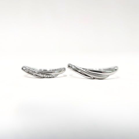 デザイン性があるのでペアリング感が強く、指輪に込められた想いも魅力的でした。 リングに少しひねりがあることで、指が細く綺麗に見えるような気がしました。 女性側の指輪にはダイアモンドがありますが、男性側の指輪にはマット加工というものができました。