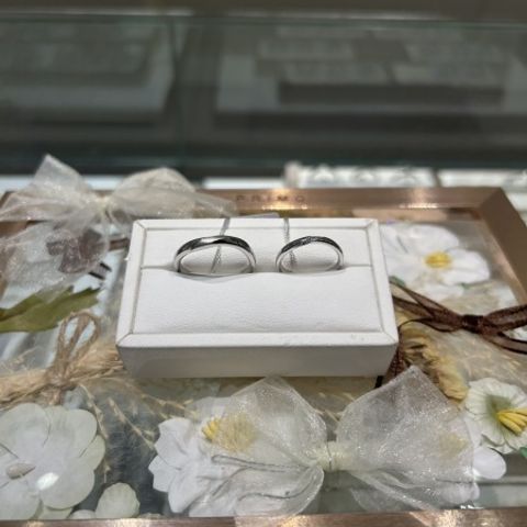 男性の指輪はオプションでマット加工しており、ギラギラし過ぎない落ち着いた印象の仕上がりになりました。女性の指輪は3石のダイヤが埋め込みされており、さりげなくキラッと光る手元に大満足です♪無料の刻印サービスや、有料のカラーストーン追加等指輪の内側にも2人だけのオリジナルを表現することができます。
