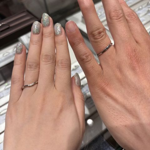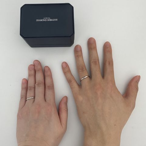 女性の方の指輪に関してですが、可愛さと女性らしさ、ダイヤモンドの輝きに一目惚れしました。実際に購入後も、どんなスタイルにも合いますし、指輪に凹凸が少なく滑らかなため、何かに引っかかることもなく着け心地がとても良いです。