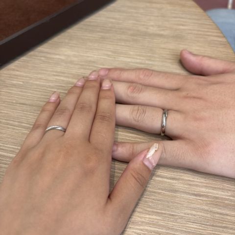 お互い違うタイプの形になりましたが、スタッフさんのおかげで似たデザインで揃えることができました! シンプルなデザインですが、マット加工が施してあるのでデザイン性もあり、とても気に入っています。 付け心地も良く、長く愛用していけそうです。