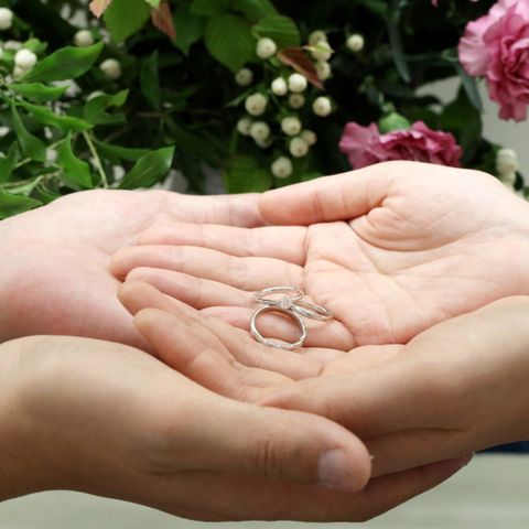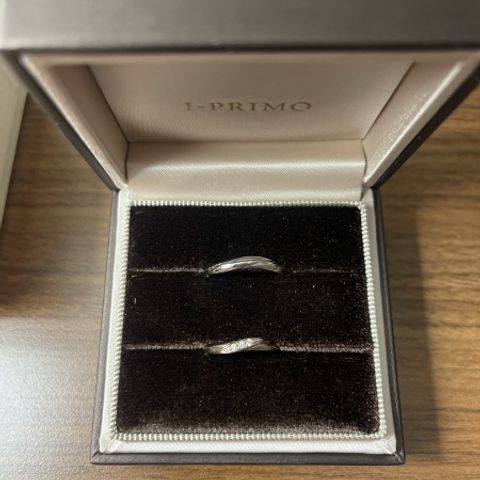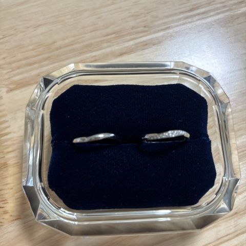 ウェーブタイプの指輪で、夫婦共に指が短め・水かき部分が深めなのですが気にならないデザイン。 指輪の中央にダイヤが入っているデザインも素敵だったのですが、自分の手を見た時にダイヤの印象が強く派手かな?と感じてしまい… あえて中心のねじれ部分に装飾はなく、周りにダイヤが入っているのが気に入っています。 夫の方は中心のねじれ部分に吹き付け加工ができるとの事で、施してもらってキラキラしすぎず少し渋めになり気に入っています。 また内側には刻印と入籍月のストーンを入れてもらいました。 こっそりお揃いという感じがして、入れてもらってよかったです。 指輪のつくりが金属を叩いてつくる鍛造というもので、型に流し込んでつくる鋳造のものよりも強度があるらしく、傷がついたり歪んだりという点も気になっていたので安心できるポイントです。